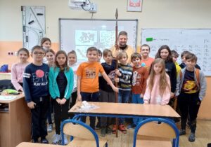Klasa 4 a miała okazję spotkać się podczas lekcji z archeologiem – badaczem dziejów Polski. Opowiadał nam o Ziemiach Polski przed przybyciem Słowian. Duże zainteresowanie wzbudziły przedmioty, jakich używali ludzie w dawnych czasach – zapinki, włócznia, grot oszczepu …