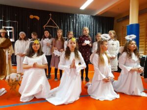 Wszyscy czekamy na przedstawienie jasełkowe. Tegoroczne spotkanie przy szopce przygotowały klasy 4b i 4c pod kierunkiem siostry Gabrieli i p. Łukasza Kubieńca. Diabły i anioły harcowały przed stajenką, a grzeczne dzieci wprowadzały nas w moc i nadzieję płynącą z Bożego Dalej …