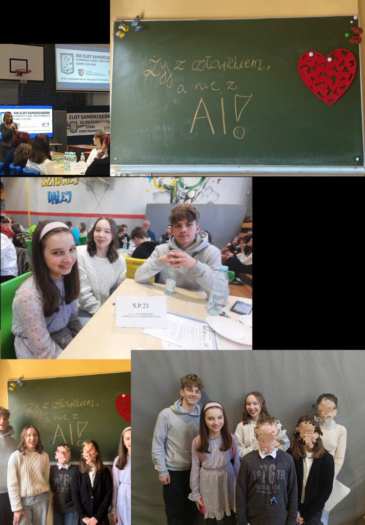 Przedstawiciele naszej  szkoły: Adam, Julia i Marta  uczestniczyli 22 kwietnia w XIII zlocie  Samorządów Uczniowskich  gliwickich szkół podstawowych w SP nr 9 pod patronatem Prezydent Miasta Gliwice Pani Katarzyny Kuczyńskiej – Budki. Podczas sesji poruszono problematykę korzystania przez dzieci i młodzież z  zasobów sztucznej inteligencji.